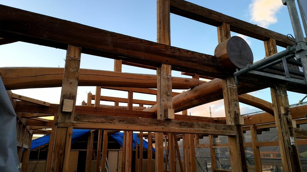 ↑まだ解体途中の写真ですが、横架材を取り外して柱だけ立ってる状態から加工を初めていくわけです