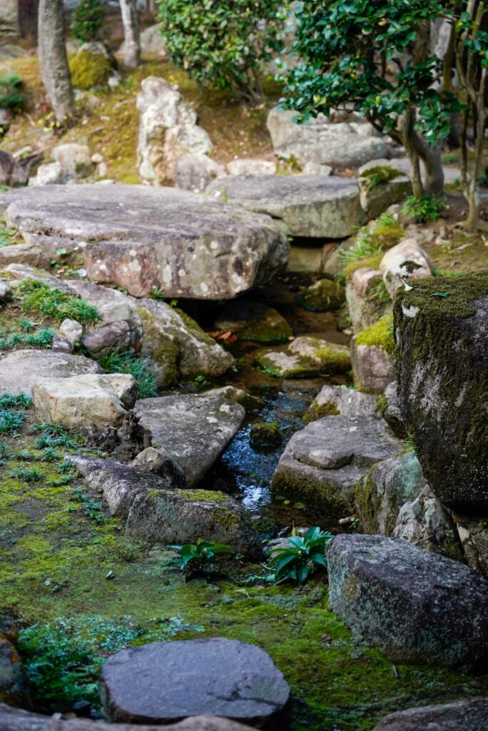 これだけ大きな灯篭が池の上にはねだしているのです!左側の大きな岩がカウンターウェイトになっているのかとは思いますが、構造に驚きを禁じえませんでした。