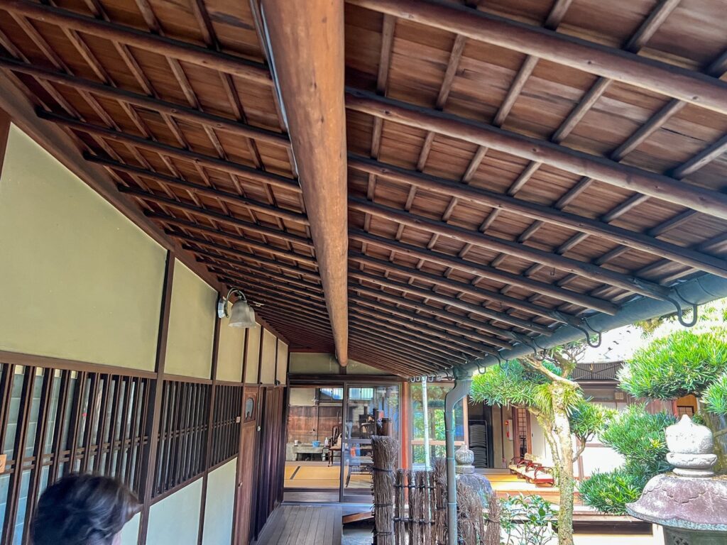 小径丸太が、なんと約10mも飛んでいます。しかも受けている両端部は下まで柱が落ちていません!いくら屋根だけとはいえ、昔ながらの重い瓦屋根がのっているのに、どうやって成り立っているんだろう!?そんな会話をしながら見学しているのは私たちぐらいでした(笑)構造の件はさておき、丸太桁に丸太垂木の軒裏が作るその空気は、現代の住宅では目にかかることは少なく、古民家ならではといえばそれまでかもしれませんが、『木』らしさが感じらる木造建築の魅力を再認識しました。