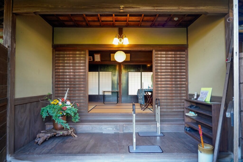 門前から厳かな空気が漂います。古民家は門がケヤキやクリなどの広葉樹で作らていることが多いのですが、こちらの門柱は立派なヒノキ。しかも外側からみると柾目というこだわり。相当な大径木だったことでしょう…