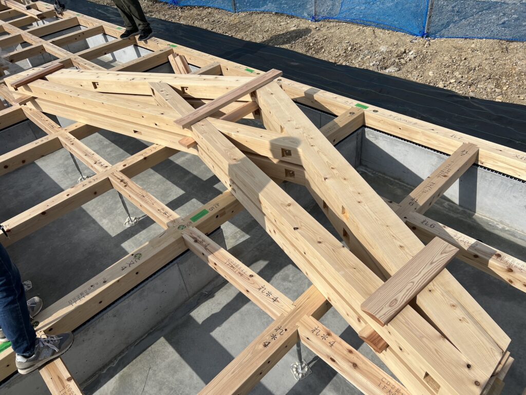 架構にはシザーズトラスを採用し、スパンを飛ばした無柱空間を作る工夫がされています。小規模な建築だからこそ、少しでも柱を少なくしたすっきりとした空間づくりを目指しています。見学は地組みだけとなってしまったので、実際に立ち上がった時にどんな軸組空間が出来上がるのか楽しみです。なかなか住宅建築ではお目にかからない架構ですが、集成材ではない製材(無垢材)で大スパンを飛ばせる工夫は、製材派の僕としてはとてもわくわくとした気持ちになりました♪